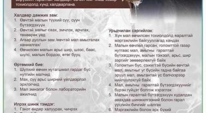 Шүлхий өвчин Төв аймгийн Бүрэн, Алтанбулаг, Баян-өнжүүл, Баян ,Баянцагаан сумдад урьдчилсан оношоор батлагдаад байна. Иймд малчин, мал бүхий иргэд гаднаас мал оруулж ирэхгүй байх мөн бусад сумдлуу шилжилт хөдөлгө...