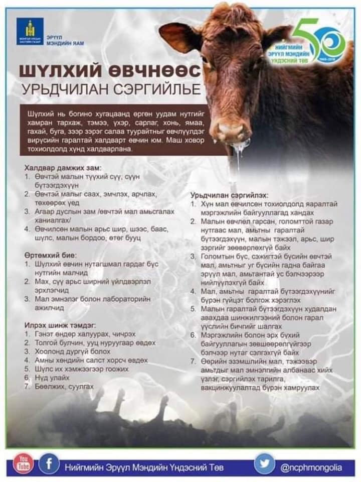 Шүлхий өвчин Төв аймгийн Бүрэн, Алтанбулаг, Баян-өнжүүл, Баян ,Баянцагаан сумдад урьдчилсан оношоор батлагдаад байна. Иймд малчин, мал бүхий иргэд гаднаас мал оруулж ирэхгүй байх мөн бусад сумдлуу шилжилт хөдөлгөөн хийхгүй байхыг анхууруулж байна !!!