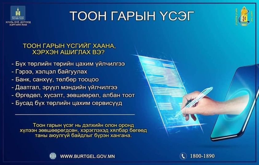 Монгол улсын 16 ба түүнээс дээш насны бүх иргэнд ТООН ГАРЫН ҮСЭГ олгох ажил Баянчандмань суманд 2022 оны 05 дугаар сарын 11-ний өдрөөс эхэллээ. Та иргэний үнэмлэхтэйгээ ирж тоон гарын үсгээ авна уу!
